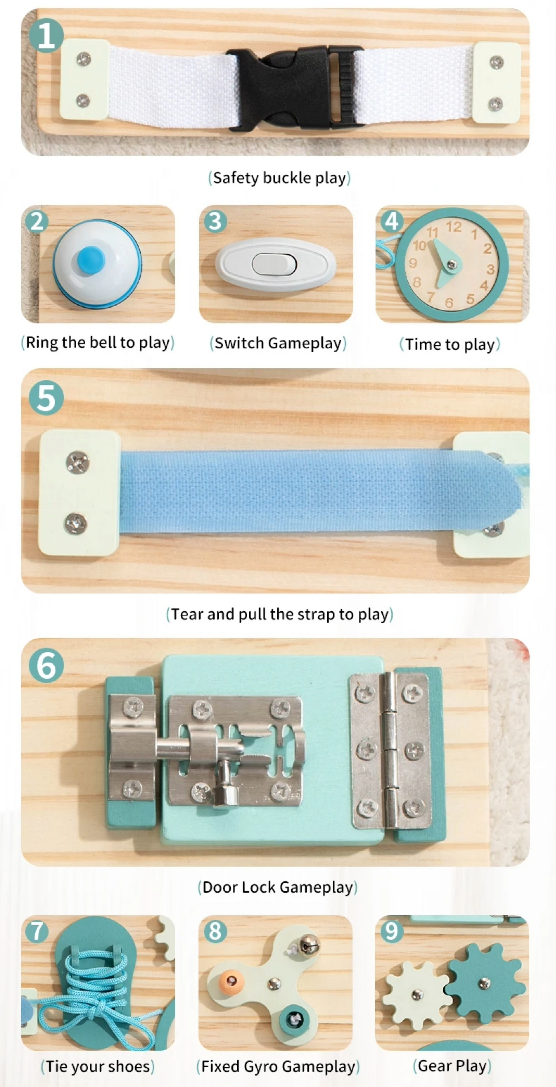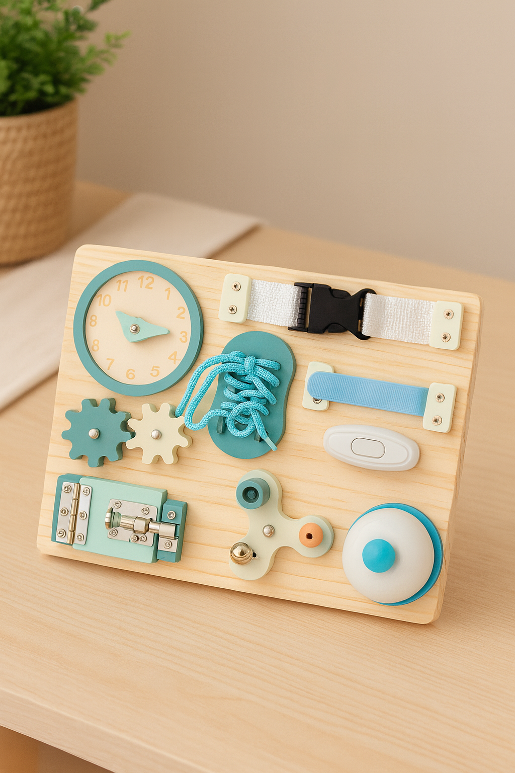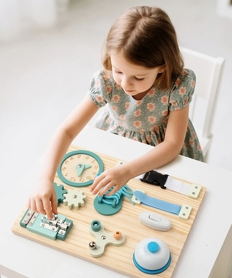 Этот бизиборд — идеальный инструмент для стимулирования **сенсорного развития** и **навыков повседневной жизни (практической жизни)** у детей дошкольного возраста. Все элементы надежно закреплены и безопасны для маленьких исследователей.