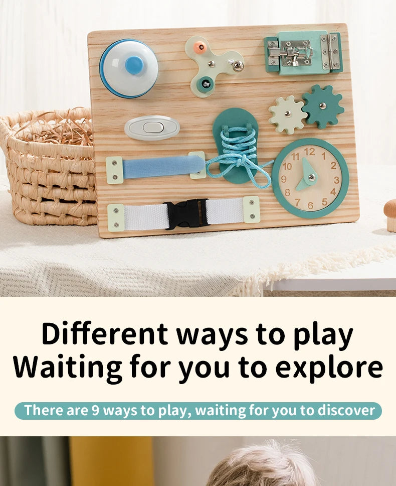 Компактный деревянный бизиборд, разработанный по методике Монтессори, предлагает 9 увлекательных элементов для развития мелкой моторики, логики и навыков самообслуживания. Эта доска является идеальной заменой гаджетам, обеспечивая часы развивающего и тихого досуга для вашего малыша.
